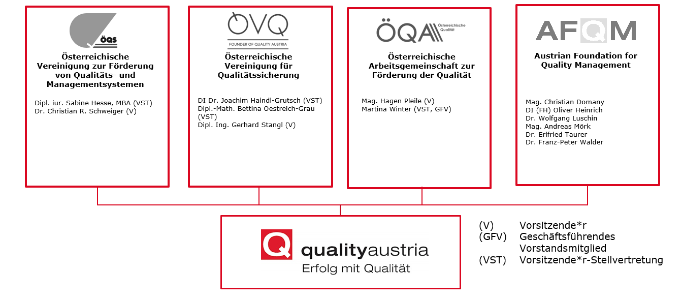 Dana 23. marta 2004. godine, na zajedničkom sastanku upravnih odbora sva četiri udruženja, utvrđeni su sledeći udeli u Quality Austria, koje su potpisali predsednici udruženja i overili kod notara: